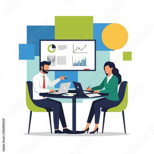 Business professionals collaborating on a project in a modern office setting.