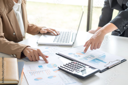 Business team meeting working with new startup project, discussion and analysis data the charts and graphs, calculator, laptop computer using, Business finances and accounting concept
