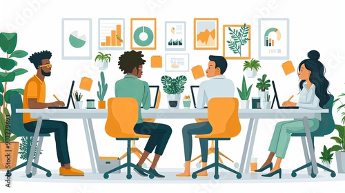 Business team working together, brainstorming, discussing ideas for project. People meeting at desk in office. illustration for co-working, teamwork, workspace concept, flat illustration