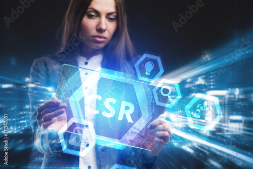 Business, Technology, Internet and network concept. Young businessman working on a virtual screen of the future and sees the inscription: CSR