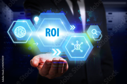 Business, Technology, Internet and network concept. Young businessman working on a virtual screen of the future and sees the inscription: ROI