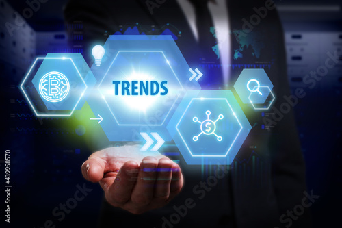 Business, Technology, Internet and network concept. Young businessman working on a virtual screen of the future and sees the inscription: Trends