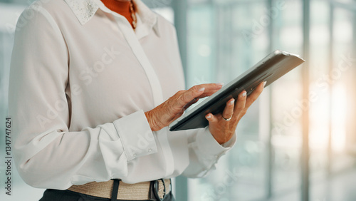 Business woman, tablet and hands with manager in office to scroll news on economy. Digital technology, internet and mature financial broker on app for investment review, profit and wealth management