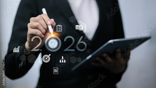Business woman touching 2026 number with protection shield and strategy icons.