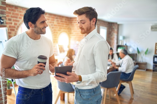 Business workers smiling happy. Standing with smile on face working together using tablet at the office