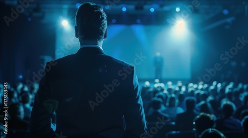 Businessman addressing a large audience at a conference.
