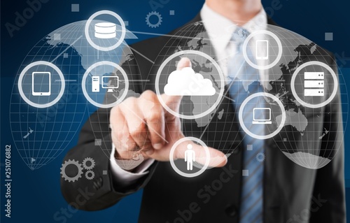 Businessman and internet and virtual reality concept - businessman pressing button on virtual screens