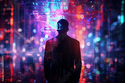 Businessman Enthralled in Neon Lit Virtual Cityscape A Captivating Inspired Immersion