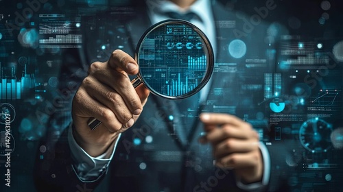 Businessman examines data insights through magnifying glass.