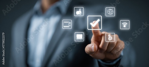 Businessman finger touching glowing checkmark icon on digital interface.