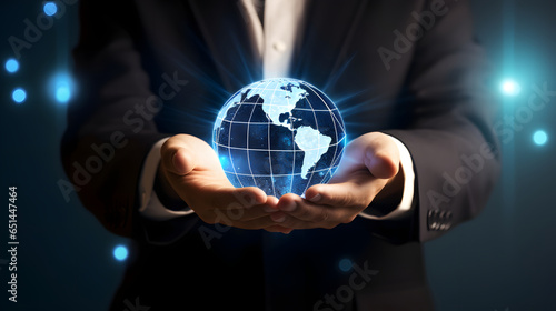 Businessman hand holding glowing blue earth hologram, business and innovative technology concept