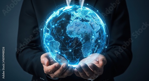 Businessman holding a glowing digital earth hologram in his hands