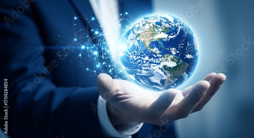 Businessman holding a glowing digital earth with connections and light streams in his hand