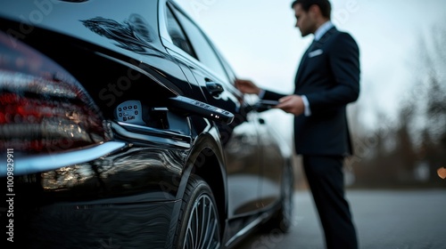 Businessman in a suit opening the door of a luxury black car with a remote control in a sophisticated setting