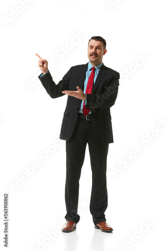 Businessman in a suit pointing with finger at blank space for text over white studio background. Plan, presentation. Concept of business, career, innovations, ad