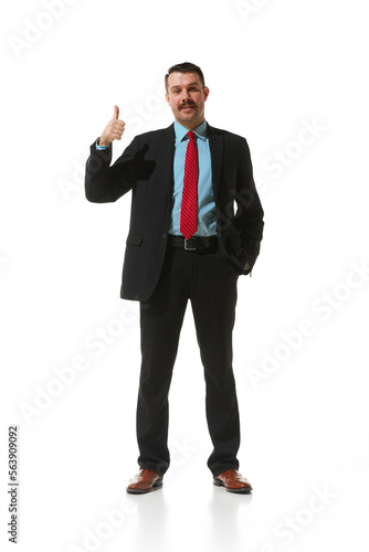 Businessman in a suit showing gesture of approvement and positivity over white studio background. Good. Concept of business, career, innovations, ad