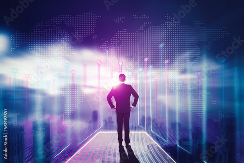 businessman in suit standing in metaverse with hands on his waist