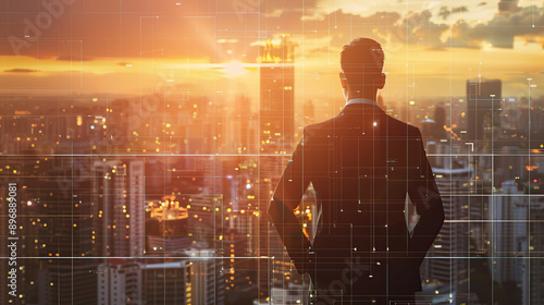 Businessman in suit standing with back to camera looking at cityscape from high building