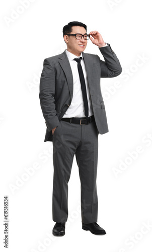 Businessman in suit wearing glasses on white background