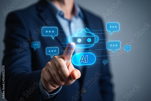 Businessman Interacting with AI Chatbot Interface on Futuristic Screen