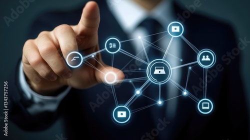 Businessman interacting with digital network interface, showcasing technology and connectivity in a modern office
