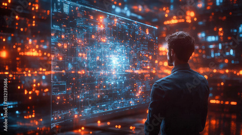 Businessman looking at a futuristic cityscape with glowing blue and orange lights, symbolizing innovation, technology, and vision