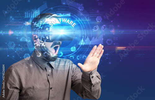 Businessman looking through Virtual Reality glasses with SOFTWARE inscription, innovative technology concept
