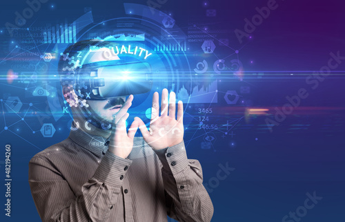 Businessman looking through VR glasses