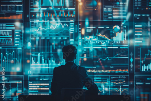 Businessman meeting with holographic market trends and consumer behavior in futuristic office. Corporate strategy for finance, operations, marketing. Generative AI.