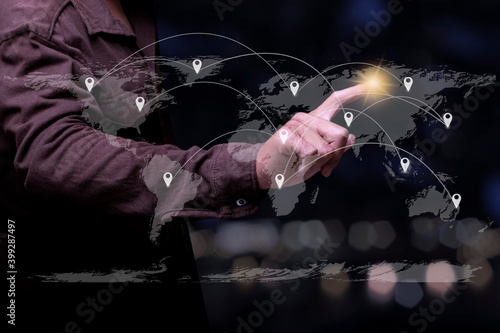 Businessman pointing spot on the global connection lines.