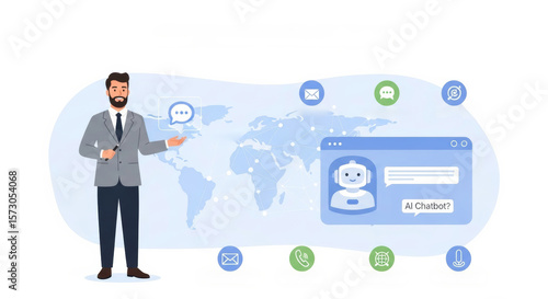 Businessman presents AI-powered customer support system featuring virtual chatbot, email, and voice assistant for global 24/7 online service and automated communication technology.