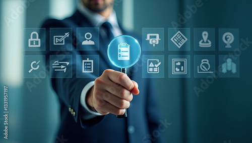 Businessman Reviewing Company Policies with Magnifying Glass Icons