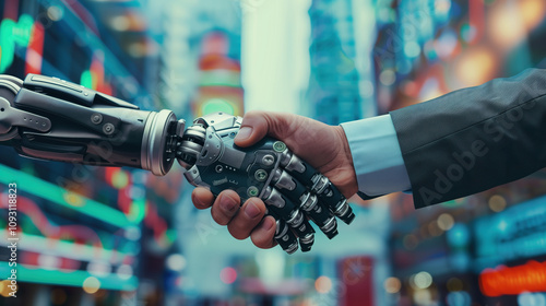 Businessman Shaking Hands with Robot in Modern Office with Financial Graphs and Digital Technology Background