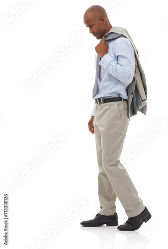 Businessman, thinking and walking or corporate decision as lawyer for future growth, problem solving or opportunity. Male person, blazer and white background in studio or question, thoughts or mockup
