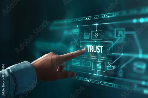 Businessman touching a virtual screen with text TRUST and an icon for social media marketing