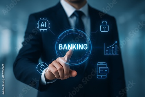 Businessman touching holographic banking interface with AI finance mobile money security growth and digital transaction concept for future financial technology innovation