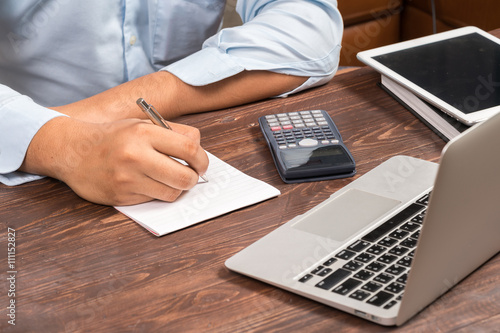 Businessman working at office desk and signing a document, computers and paperwork all around, top view