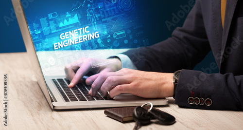 Businessman working on laptop with GENETIC ENGINEERING inscription, cyber technology concept