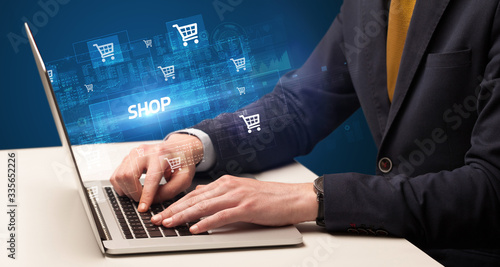 Businessman working on laptop with SHOP inscription, online shopping concept