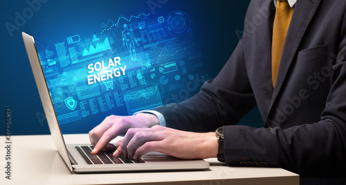 Businessman working on laptop with SOLAR ENERGY inscription, cyber technology concept
