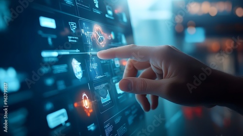 Businessman's hands working with a screen with a lot of information. The concept of focus and attention It is as if a businessman is trying to find a specific thing on the screen.