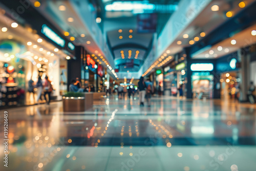 Busy crowded shopping mall interior with blurred people movement created using generative AI