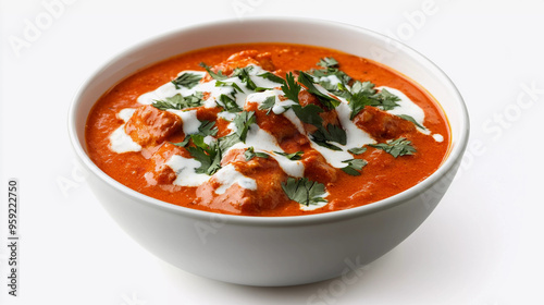 Butter chicken bowl garnished with fresh cream and coriander isolated on white background