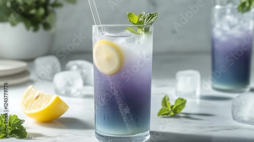 Butterfly Pea Blue Tea with flowers and milk. A glass of a cold summer drink. Caffeine free drink. Healthy food concept