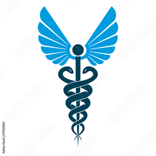Caduceus medical symbol, graphic vector emblem created with wings and snakes.