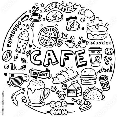Cafe doodle template design, hand drawn sketchy vector symbols and objects, vector elements of coffee, cupcakes, dessert, coffee cups, restaurant wall doodle, vector food art, paper and any ideas