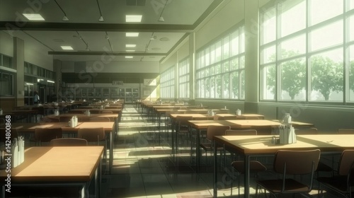 Cafeteria in anime style, tables neatly arranged, soft light pouring through windows, no people in the scene