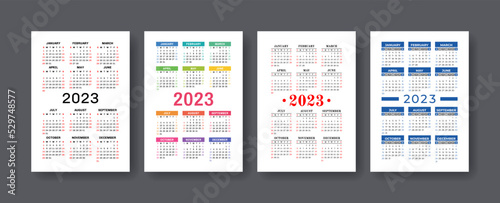 Calendar 2023 year set. Vector vertical template collection. Ready design. January, February, March, April, May, June, July, August, September, October, November, December