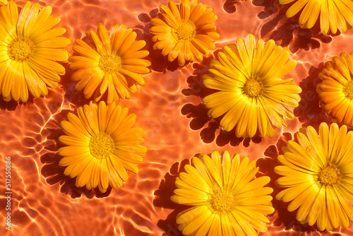 Calendula flowers floaty on orange water surface background. Beautiful SPA or summer concept background. Flat lay.