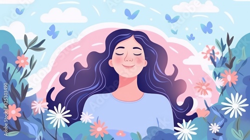 Calm and peaceful woman surrounded by flowers and butterflies.